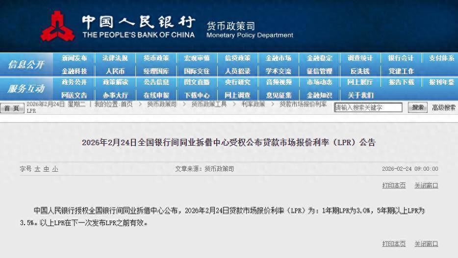 据中国人民银行2月24日消息,中国人民银行授权全国银行间同业拆借中心公布,2026年2月24日贷款市场报价利率(LPR)为:1年期LPR为3.0%股票在线配资股票在线配资,5年期以上LPR为3.5%。以上LPR在下一次发布LPR之前有效。