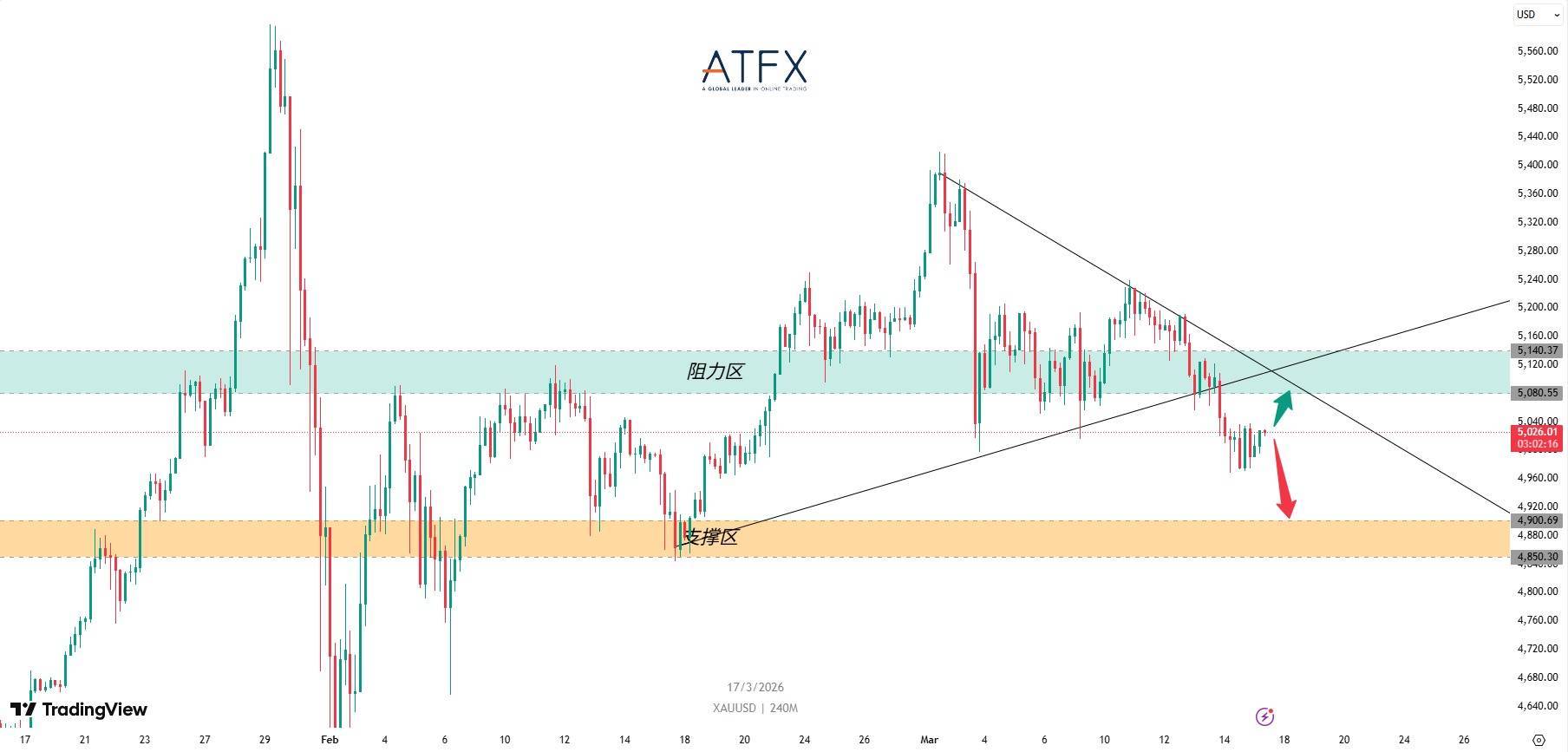 相反,若金价有效跌破5000美元关口,同时美元与收益率继续走高,则可能打开进一步下行空间,下方支撑将指向4850–4900区间。尤其是在美联储偏鹰的情境下,这一空头路径的概率将显著上升。