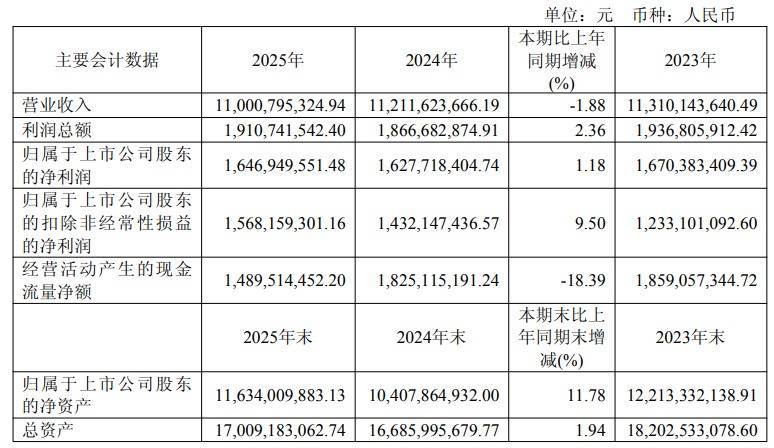 财报显示,2025年,华润双鹤实现营业收入110.01亿元,同比下滑1.88%;归属于上市公司股东的净利润16.47亿元,同比增长1.18%。