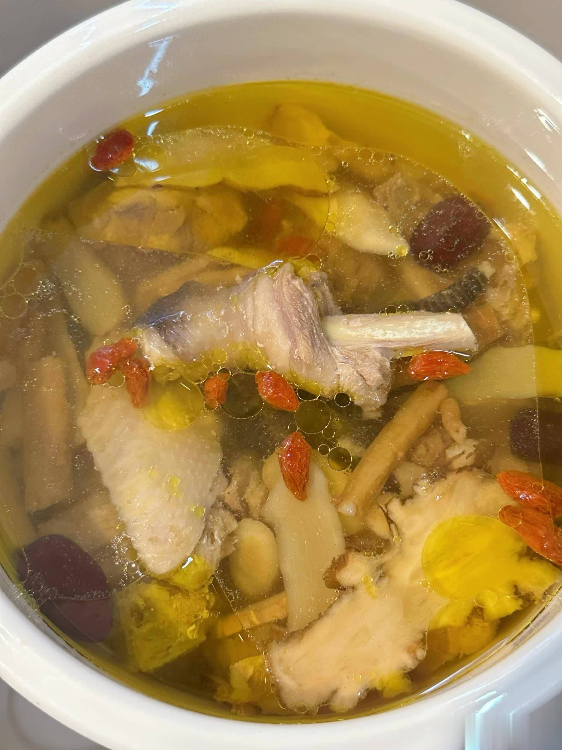 乌鸡冷水下锅。把剁好的乌鸡放进锅里,加几片姜,开火煮开。水开了会飘一层浮沫,把乌鸡捞出来,用温水冲干净。这一步别偷懒,去了浮沫的汤才清亮不腥。除了枸杞,其他所有食材都扔进炖锅。焯好水的乌鸡、当归、党参、黄芪、玉竹、红枣,统统放进去。加足冷水,没过食材再多一些。开炖!我一般用电炖锅,设个两小时。如果用砂锅的话,大火烧开转小火,慢炖一个半小时左右。快关火前十分钟,把枸杞撒进去,再加一点点盐调味就行。