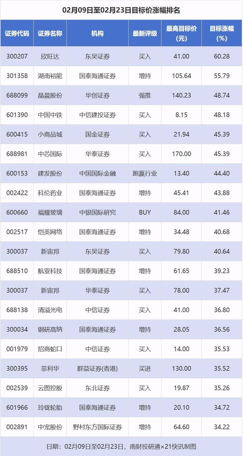 南财投研通数据显示,2月9日至2月23日,券商给予上市公司目标价共70次,按最新收盘价计算,目标价涨幅排名居前的公司有欣旺达、湖南裕能、晶晨股份,目标价涨幅分别为60.28%、55.79%、48.74%。