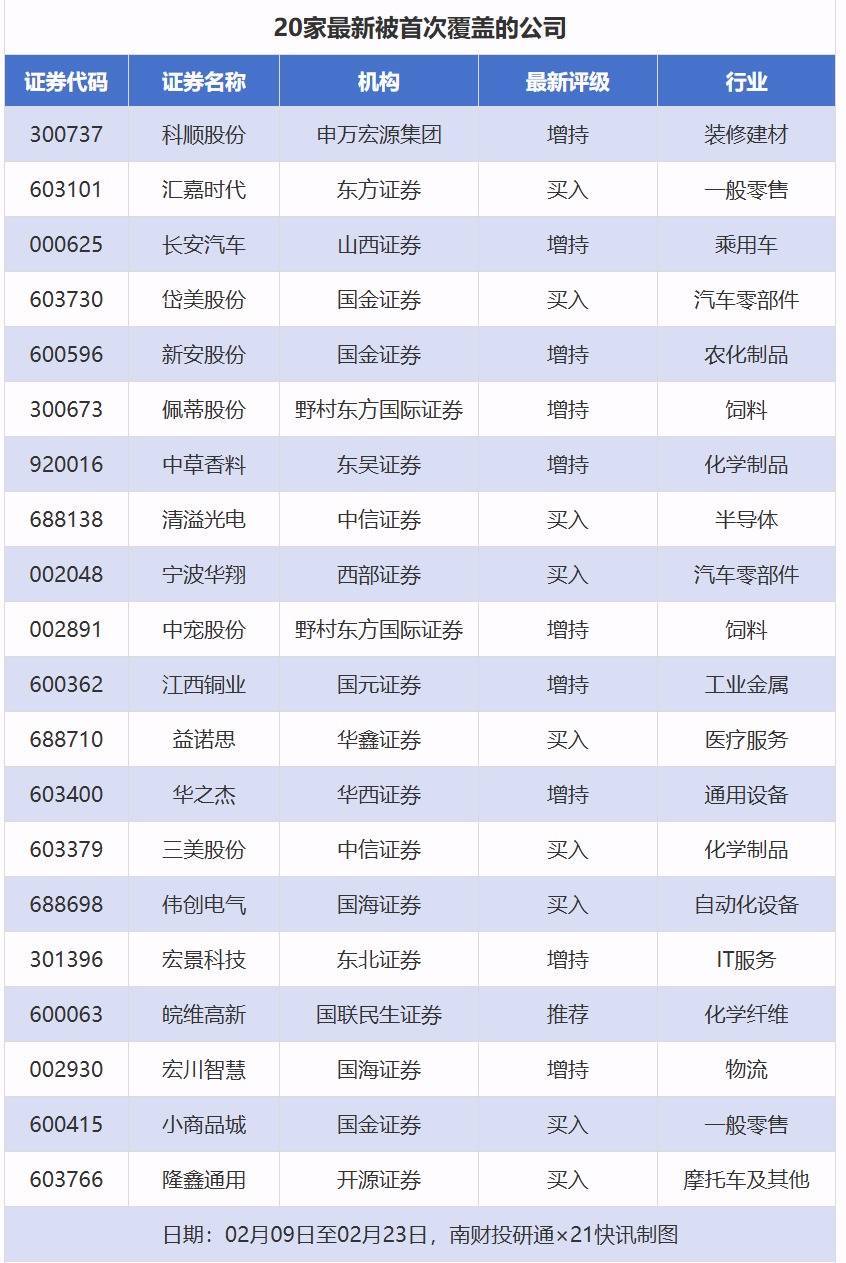 首次覆盖方面,2月9日至2月23日券商共给出了81次首次覆盖,其中科顺股份获得申万宏源集团给予“增持”评级,汇嘉时代获得东方证券给予“买入”评级,长安汽车获得山西证券给予“增持”评级,岱美股份、新安股份获得国金证券分别给予“买入”“增持”评级。