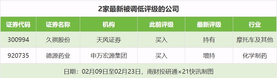 评级调低方面,2月9日至2月23日,券商调低上市公司评级达到2家次,最新数据包括了天风证券对久祺股份的评级从“买入”调低至“持有”,申万宏源集团对德源药业的评级从“买入”调低至“增持”。