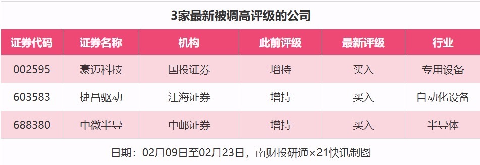 评级调高方面,2月9日至2月23日,券商调高上市公司评级达到3家次,最新数据包括了国投证券对豪迈科技的评级从“增持”调高至“买入”,江海证券对捷昌驱动的评级从“增持”调高至“买入”,中邮证券对中微半导的评级从“增持”调高至“买入”。