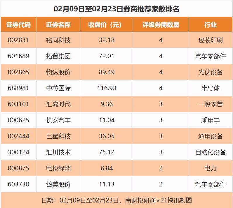 从券商推荐家数来看,2月9日至2月23日有205家上市公司得到券商推荐,其中裕同科技、拓普集团、钧达股份等获得4家推荐。