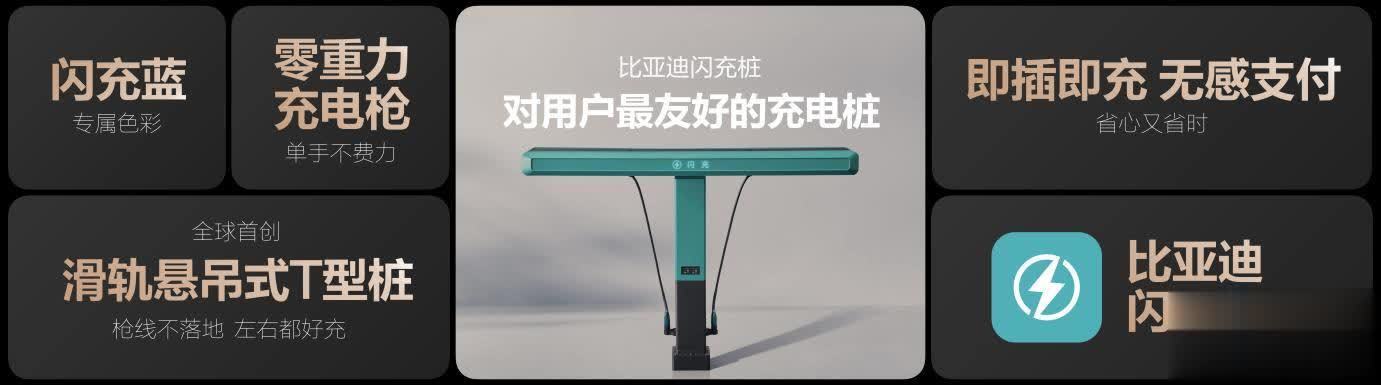 配套的闪充桩单枪功率达1500kW,是目前全球量产最大功率的充电桩。为解决电网容量问题,比亚迪引入储能系统配合使用。充电桩采用滑轨悬吊式设计,枪线轻巧悬空,配合APP实现“即插即充、无感支付”,致力于解决传统充电桩枪重、线脏、流程繁琐的痛点。