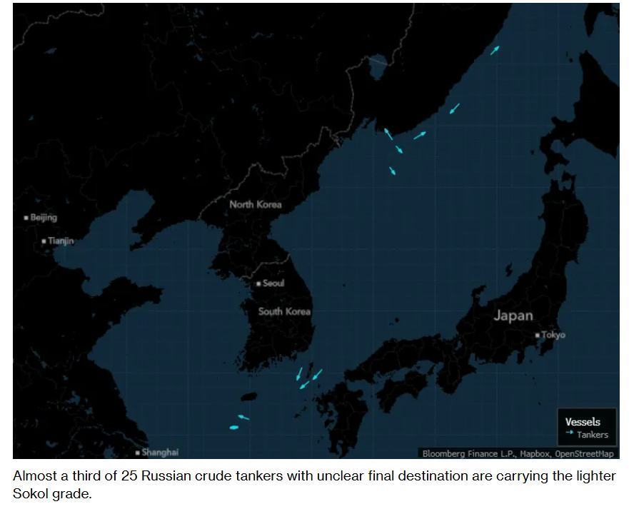 上图为机构最新汇编的俄罗斯东部外海装载俄罗斯原油的大型油轮。据了解,在25艘最终目的地尚不明确的俄罗斯原油油轮中,近三分之一装载的是较轻质的索科尔原油。