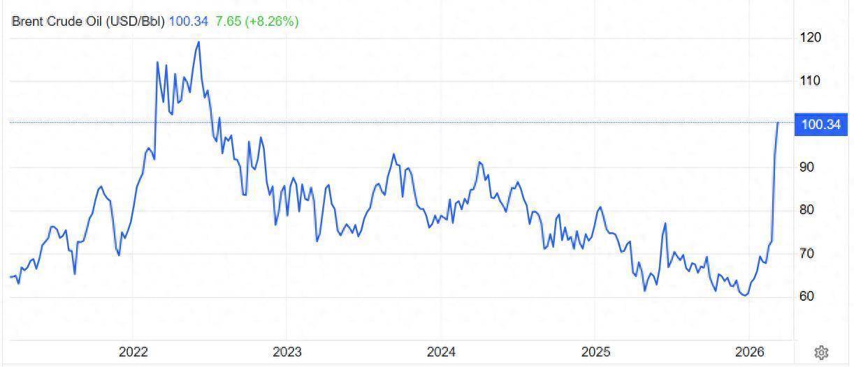 在俄油开始重新流入市场的相关新闻动态影响之下,国际油价在周五涨势显著缓和。截至发稿,布伦特原油期货价格周五涨幅不到1%,徘徊在每桶100美元附近,但是周涨幅仍然接近9%,自伊朗战争以来,布伦特原油涨幅高达50%,在2026年3月9日(周一)一度飙升至每桶119.50美元的2022年俄乌冲突以来的最高位。