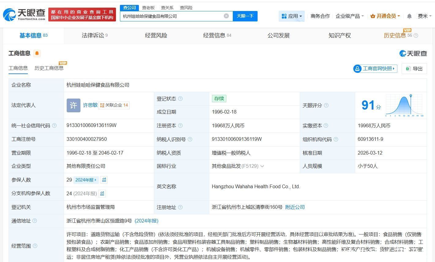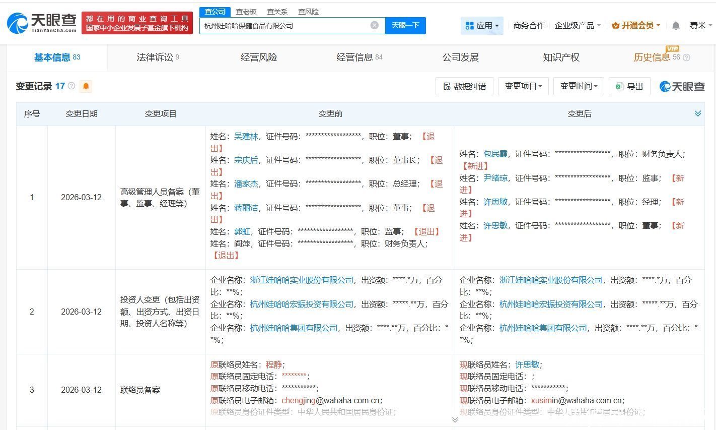 天眼查工商信息显示,近日,杭州娃哈哈保健食品有限公司发生工商变更,宗庆后卸任法定代表人、董事长,潘家杰卸任总经理,许思敏任法定代表人、董事、经理。